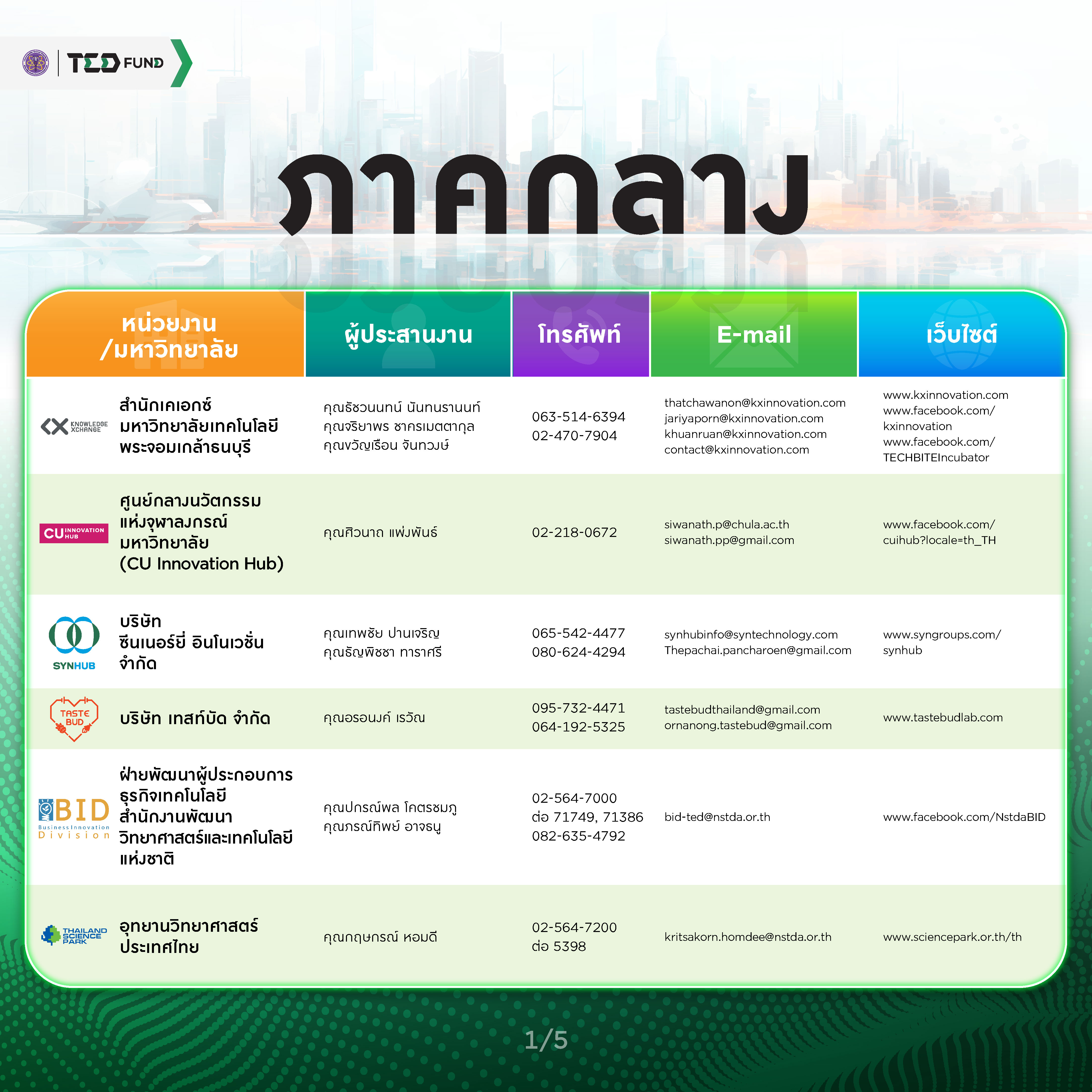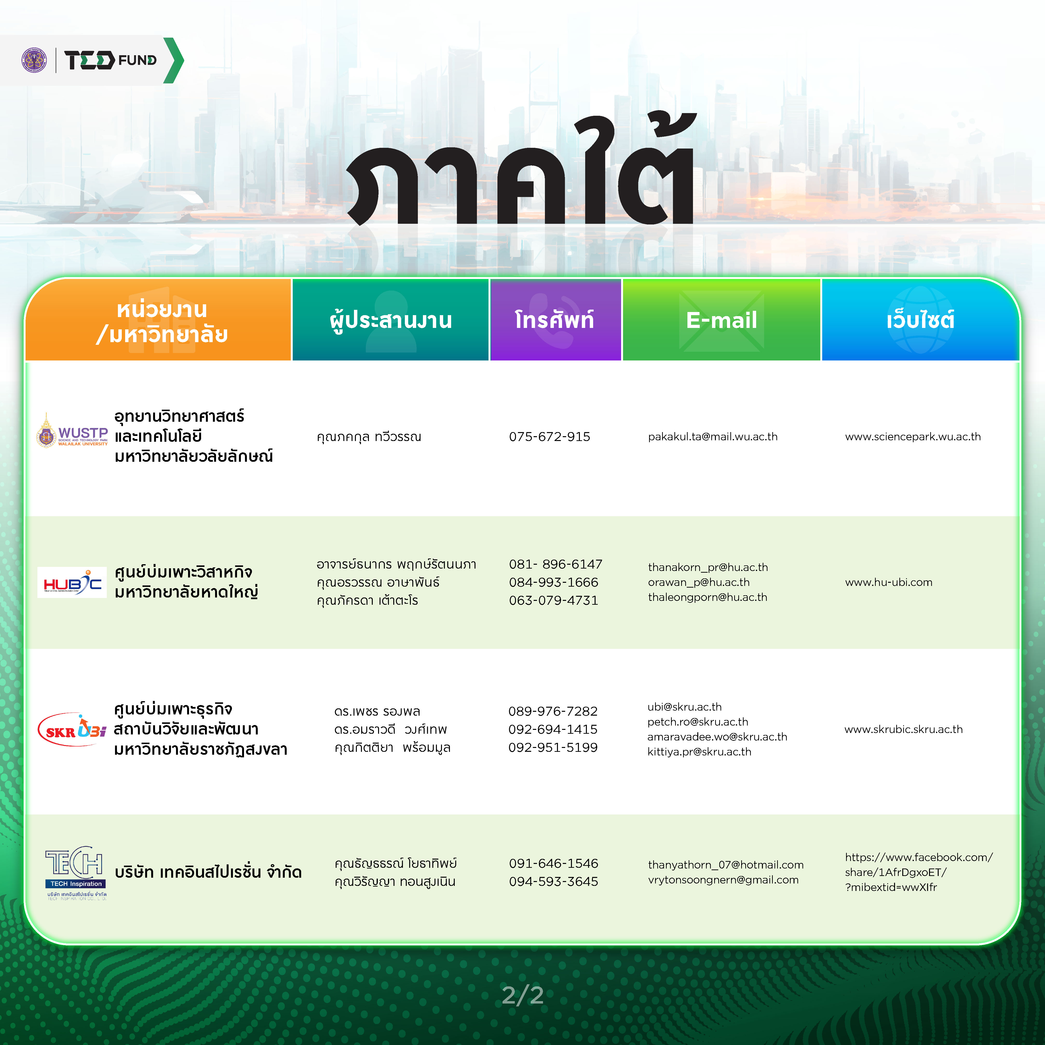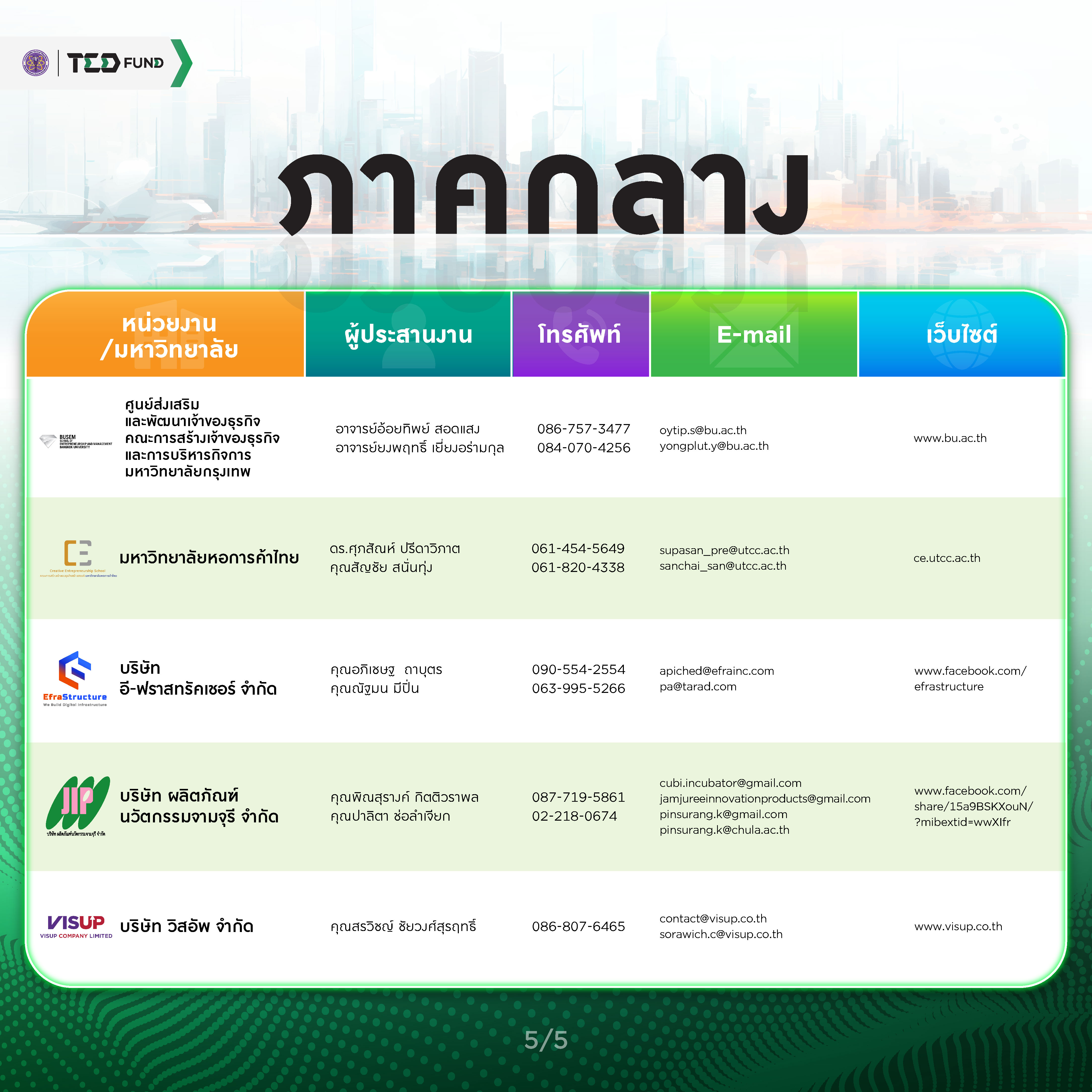 ประกาศรายชื่อเครือข่ายร่วมพัฒนาผู้ประกอบการ (TED Fellow) ที่พร้อมร่วมสนับสนุนผู้ประกอบการรุ่นใหม่เข้าร่วมโครงการ TED Youth Startup รอบที่ 2 / 2569 จำนวน 55 หน่วยงาน ได้แก่