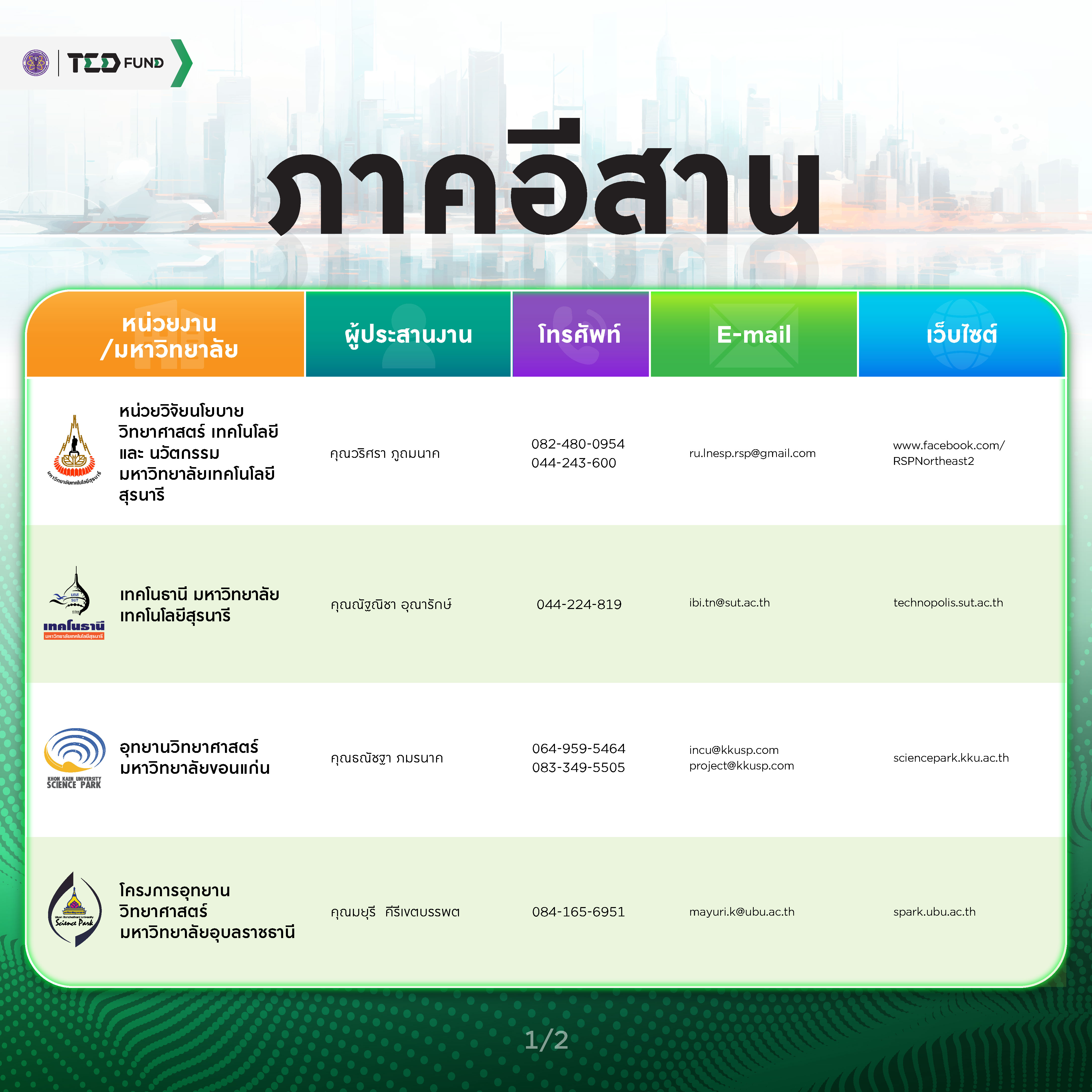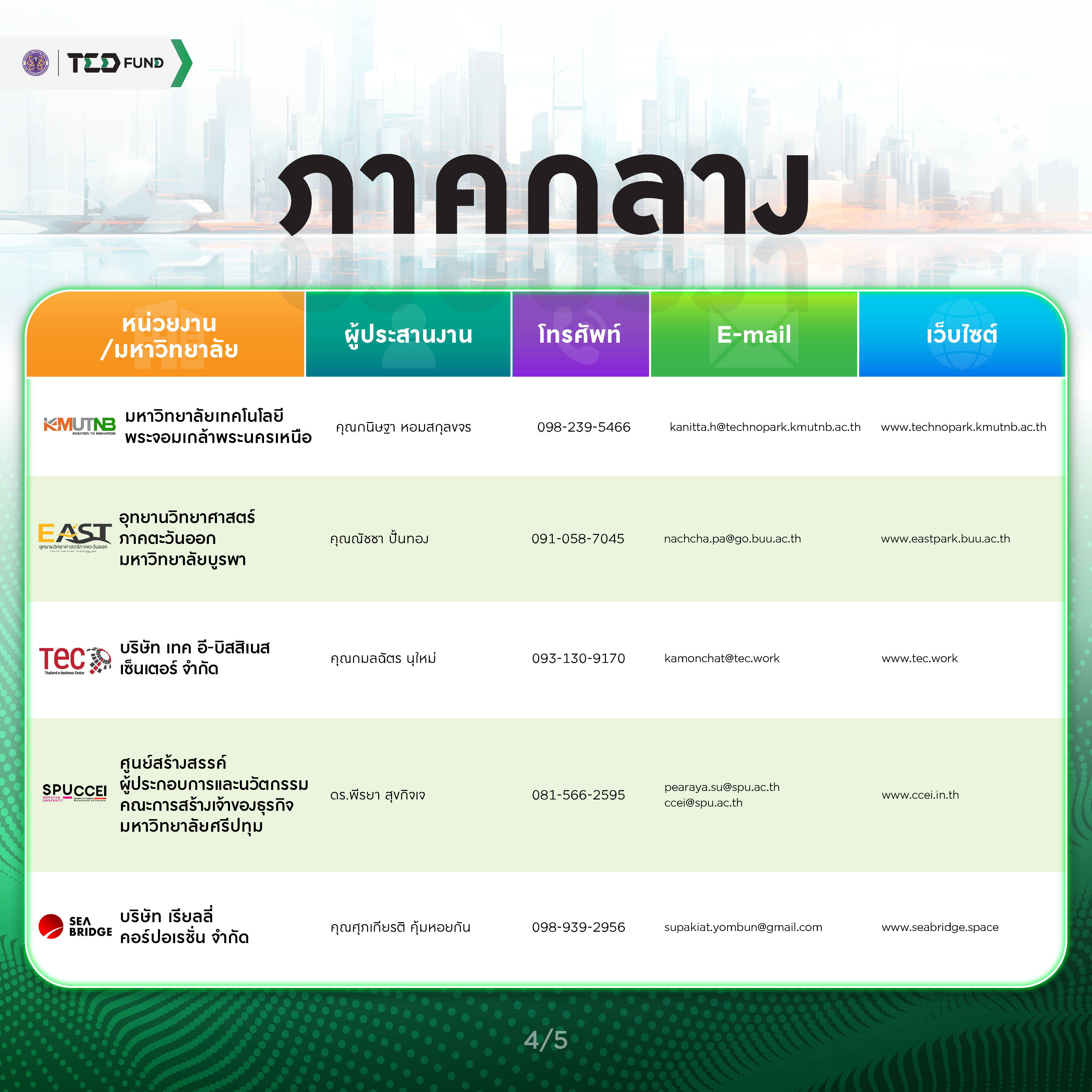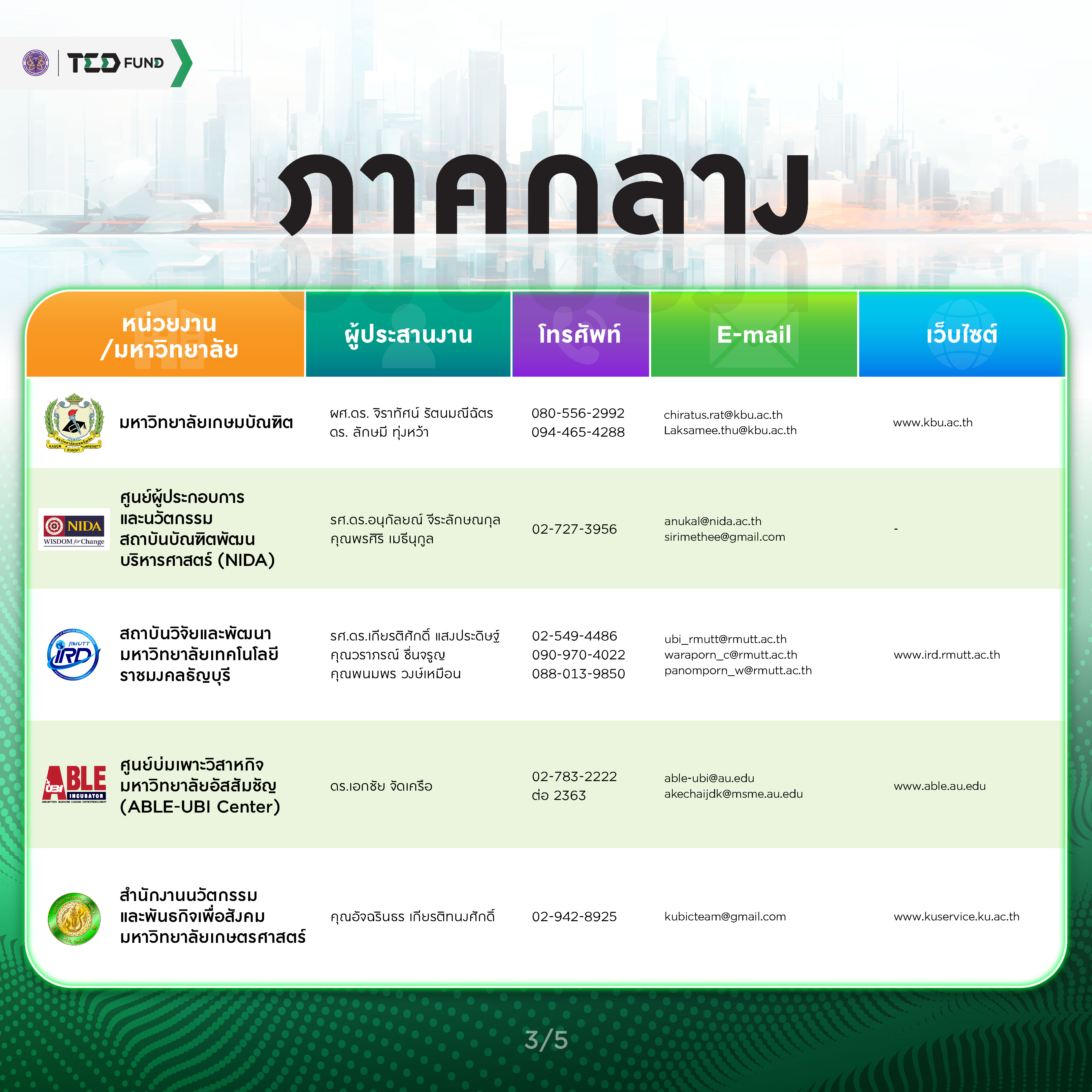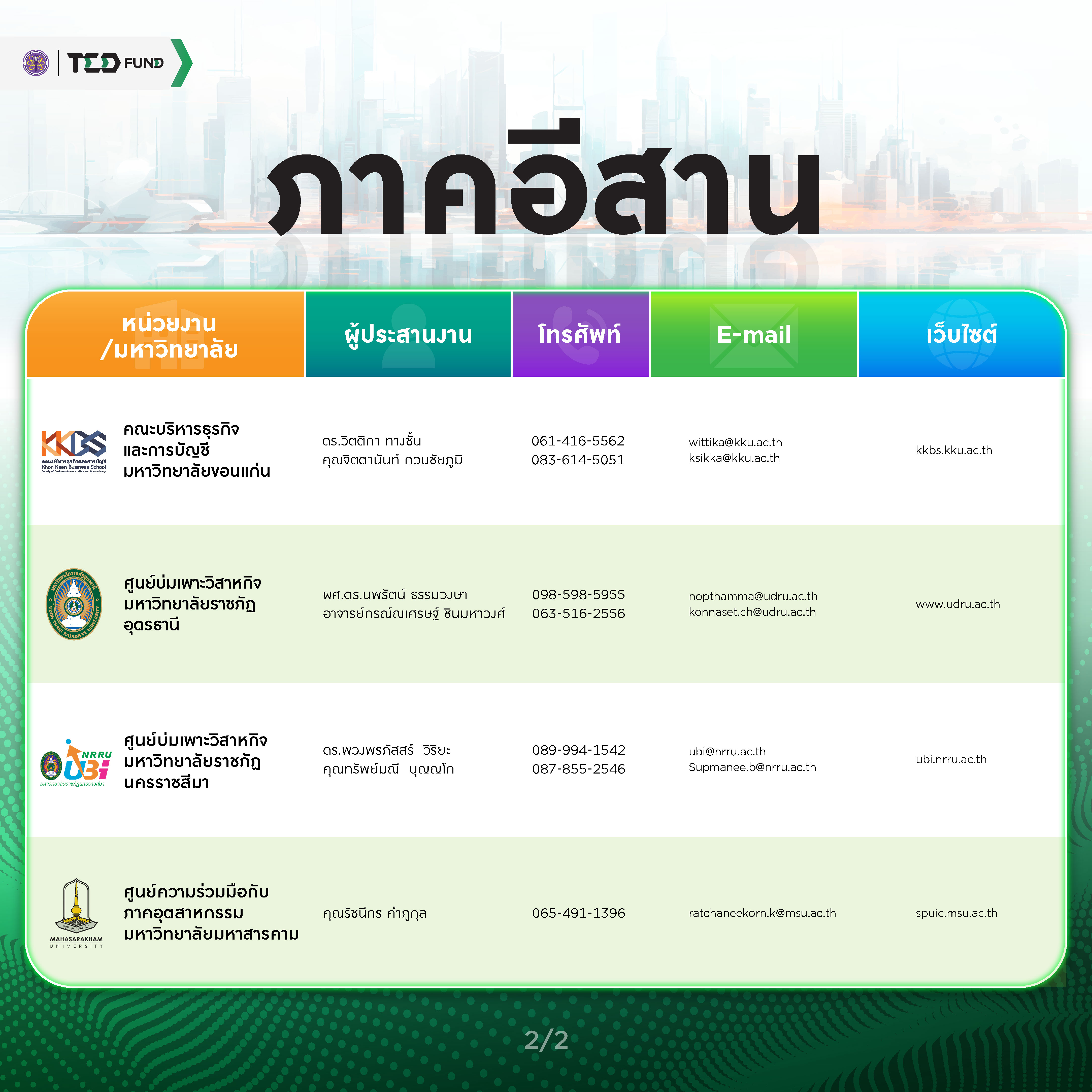 ประกาศรายชื่อเครือข่ายร่วมพัฒนาผู้ประกอบการ (TED Fellow) ที่พร้อมร่วมสนับสนุนผู้ประกอบการรุ่นใหม่เข้าร่วมโครงการ TED Youth Startup รอบที่ 2 / 2569 จำนวน 55 หน่วยงาน ได้แก่