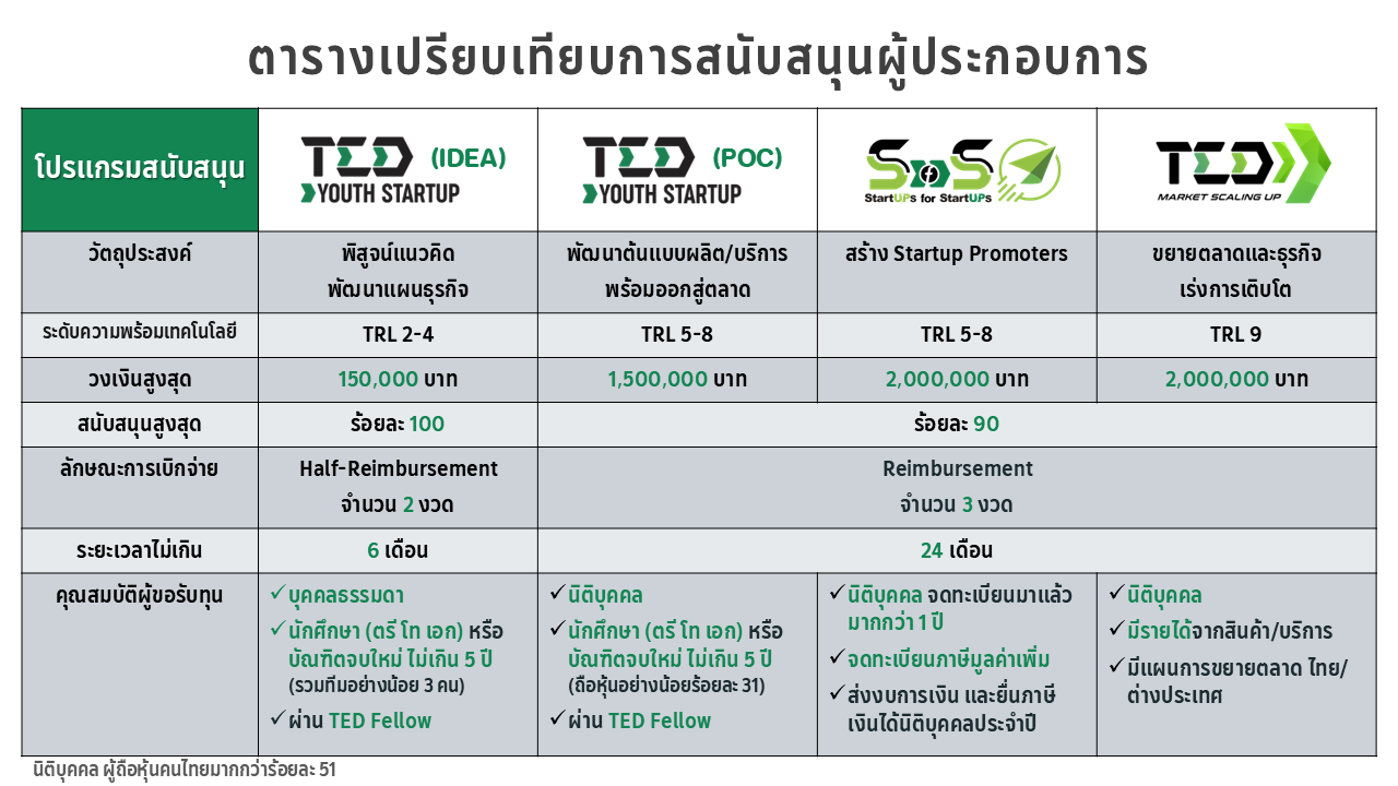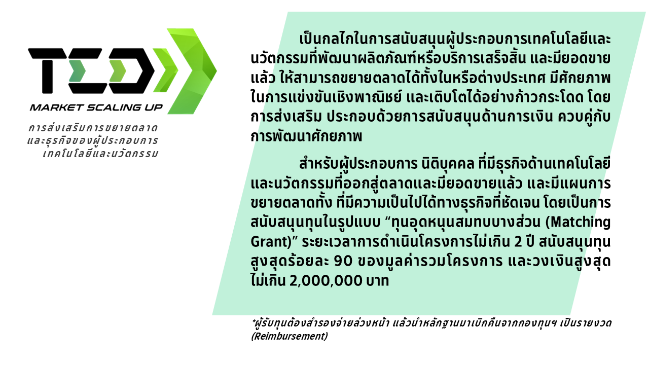 - การส่งเสริมการขยายตลาดและธุรกิจของผู้ประกอบการเทคโนโลยีและนวัตกรรม (TED Market Scaling Up)