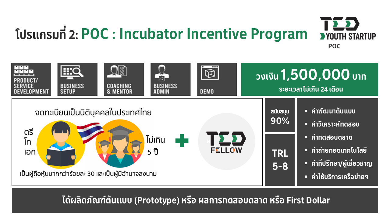 เพื่อพัฒนาต้นแบบ (Prototype) ซึ่งเป็นการพิสูจน์ความคิดใหม่ทั้งด้านเทคโนโลยีและด้านธุรกิจ ผ่านเครือข่ายร่วมพัฒนาผู้ประกอบการ (TED Fellow) ซึ่งมีระยะเวลาการดำเนินโครงการไม่เกิน 2 ปี โดยกองทุนฯ จะให้การสนับสนุนทุนไม่เกินร้อยละ 90 ของมูลค่าโครงการ ทั้งนี้วงเงินไม่เกิน 1,500,000 บาท ซึ่งหมวดค่าใช้จ่ายที่ให้การสนับสนุน มีดังนี้