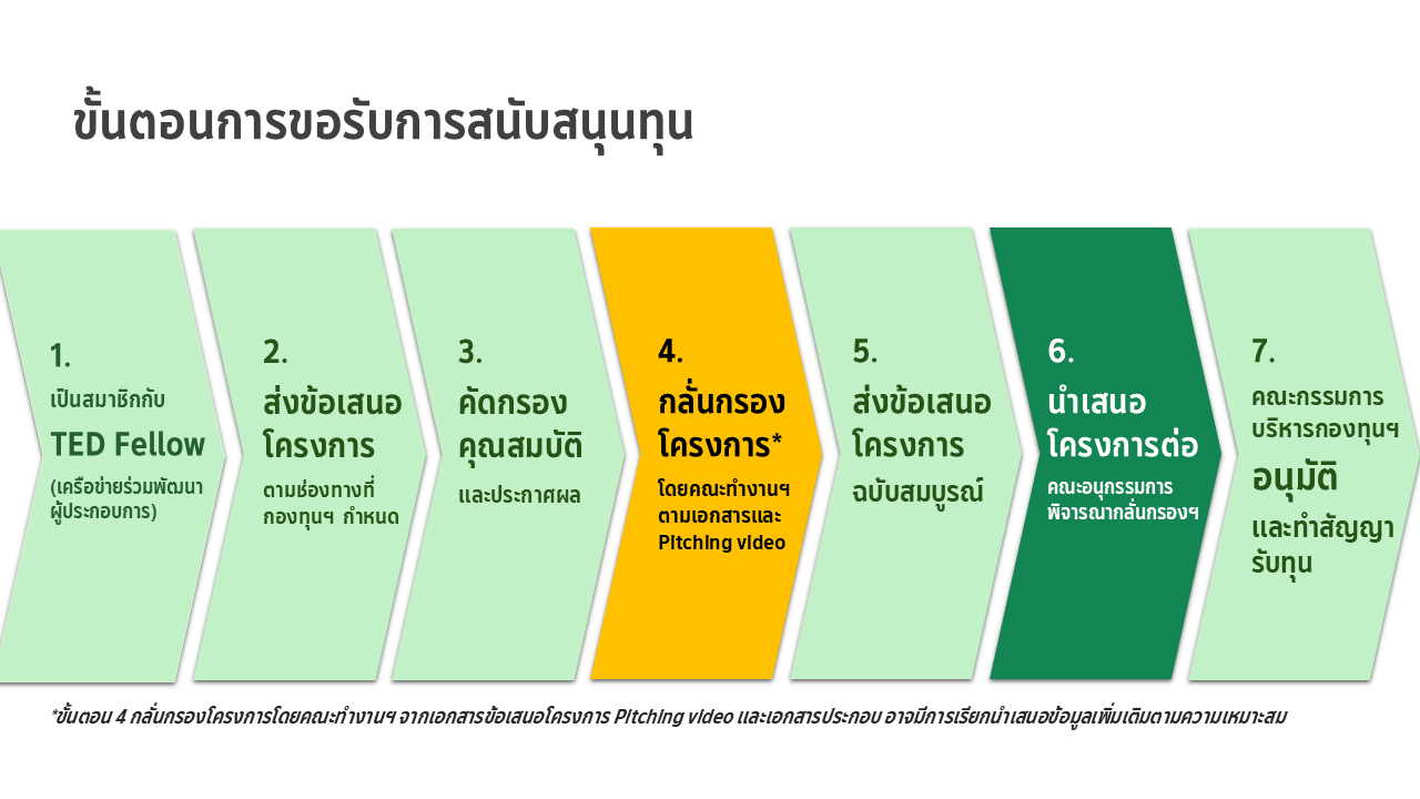 เพื่อเป็นค่าพัฒนาต้นแบบ (Mockup) และแผนธุรกิจฉบับสมบูรณ์ ผ่านเครือข่ายร่วมพัฒนาผู้ประกอบการ (TED Fellow) ที่ได้รับการรับรอง ซึ่งมีระยะเวลาการดำเนินโครงการไม่เกิน 6 เดือน โดยกองทุนฯ จะให้การสนับสนุนทุนวงเงินไม่เกิน 150,000 บาท โดยจะสนับสนุนค่าใช้จ่ายในสัดส่วนร้อยละ 100 ซึ่งหมวดค่าใช้จ่ายที่ให้การสนับสนุน มีดังนี้