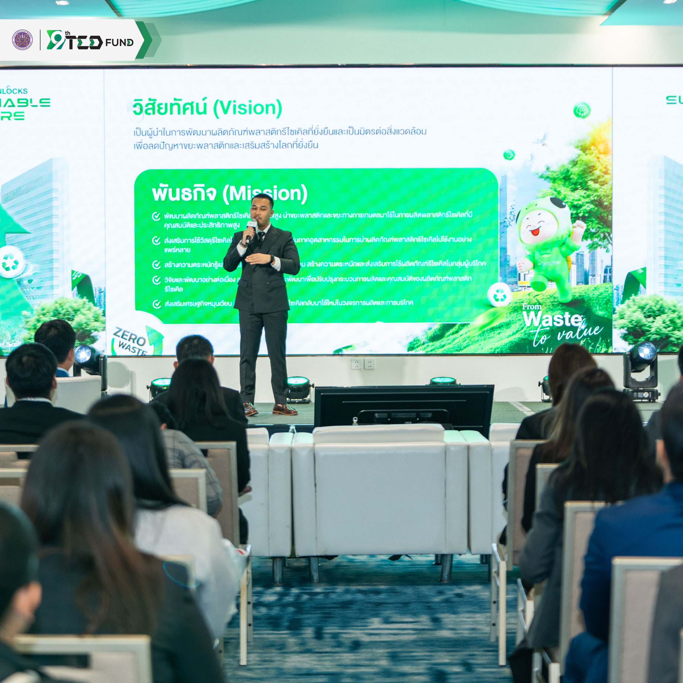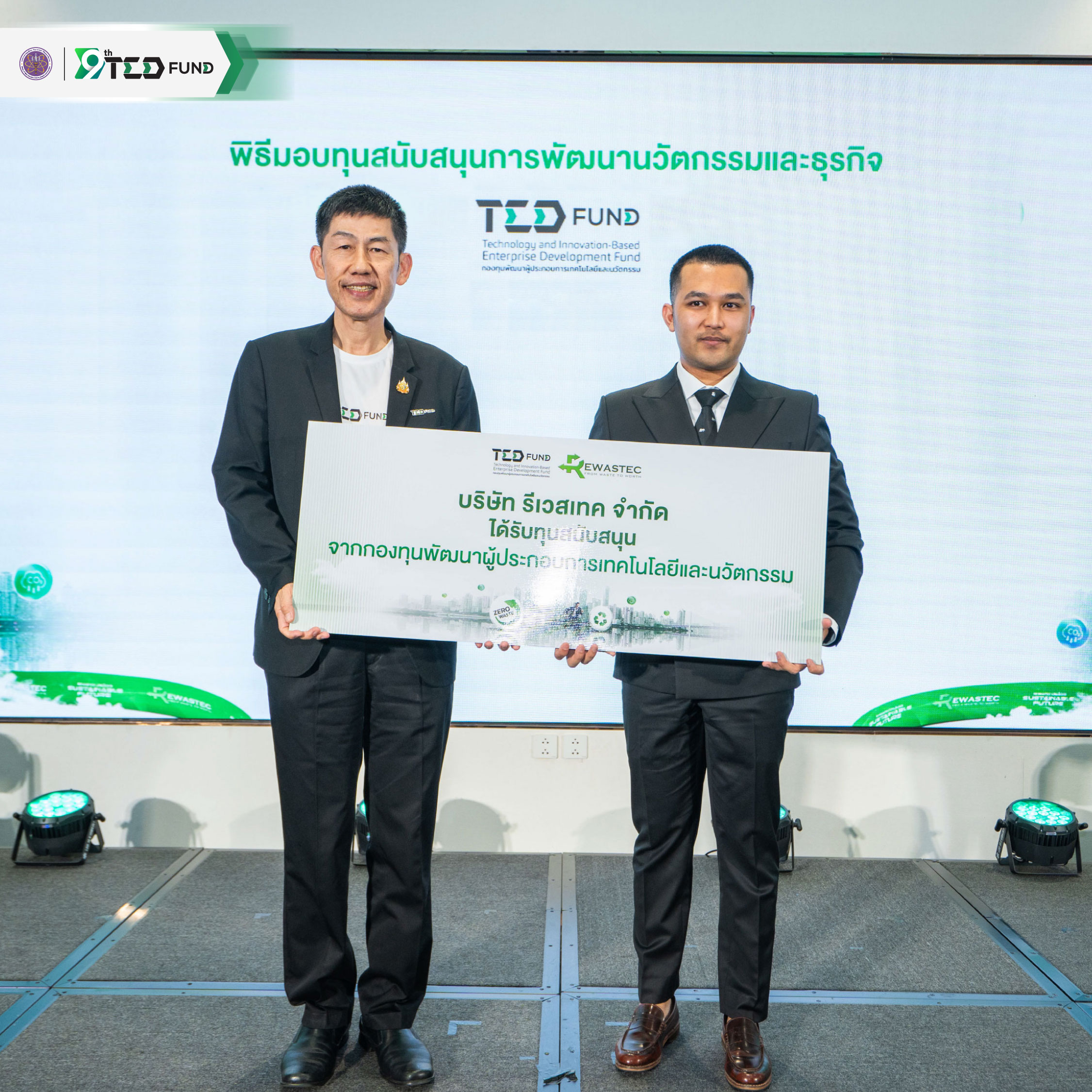 ในโอกาสนี้ น.สพ.ดร.สนัด วงศ์ทวีทอง ผู้จัดการกองทุน TED Fund ได้ให้เกียรติเข้าร่วมงาน พร้อมทั้งมอบทุนสนับสนุนการพัฒนานวัตกรรมและธุรกิจแก่บริษัท รีเวสเทค จำกัด (Rewastec) เพื่อเสริมศักยภาพการพัฒนาเทคโนโลยีด้านวัสดุรีไซเคิล และสนับสนุนการขับเคลื่อนระบบเศรษฐกิจหมุนเวียนของประเทศให้เกิดผลอย่างเป็นรูปธรรม