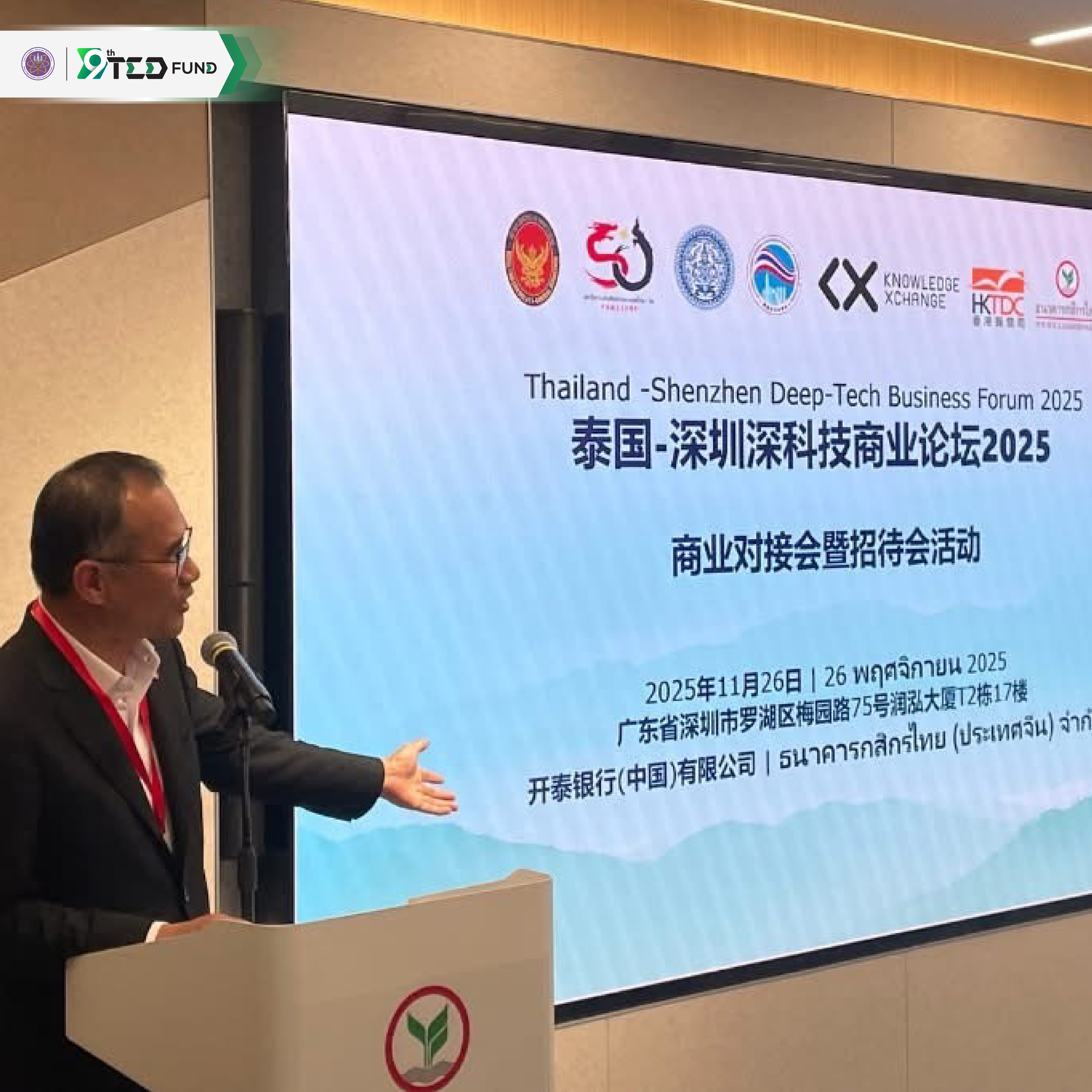 กองทุนพัฒนาผู้ประกอบการเทคโนโลยีและนวัตกรรม (TED Fund) ได้รับเกียรติจาก สำนักเคเอกซ์ มหาวิทยาลัยเทคโนโลยีพระจอมเกล้าธนบุรี (KX–KMUTT) เชิญเข้าร่วมโปรแกรม “Thailand–Shenzhen Deep-Tech Business Forum” ซึ่งจัดโดย กระทรวงการต่างประเทศ (กรมเศรษฐกิจระหว่างประเทศ) ร่วมกับ สถานกงสุลใหญ่ ณ นครกว่างโจว ระหว่างวันที่ 25–29 พฤศจิกายน 2568 ณ นครกว่างโจวและเมืองเซินเจิ้น สาธารณรัฐประชาชนจีน โดยมี นางสาวสาวิตรี กระจ่างศิวาลัย หัวหน้างานพัฒนาธุรกิจ ฝ่ายพัฒนาโครงการ เป็นผู้แทนของ TED Fund เข้าร่วมกิจกรรม
