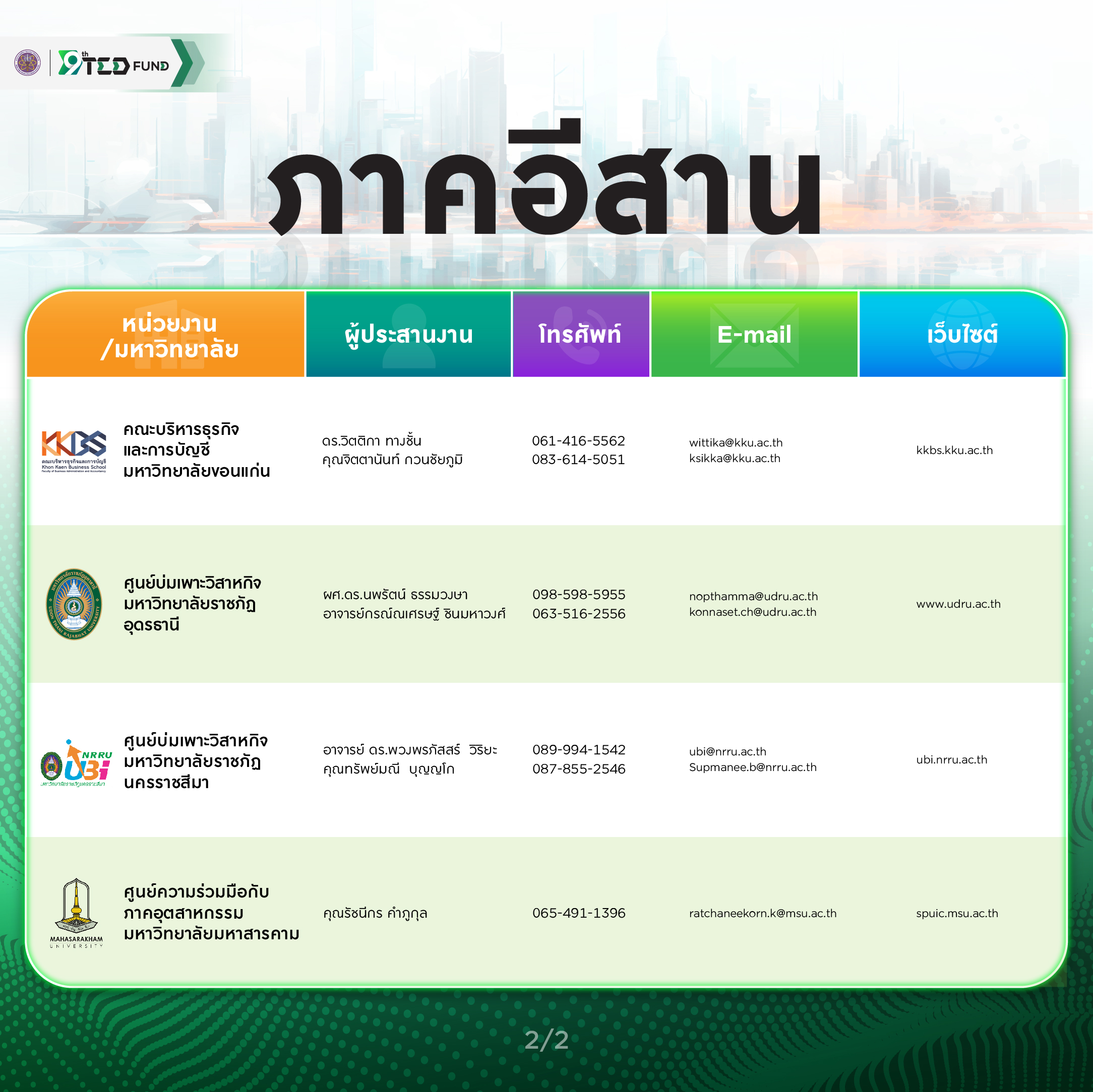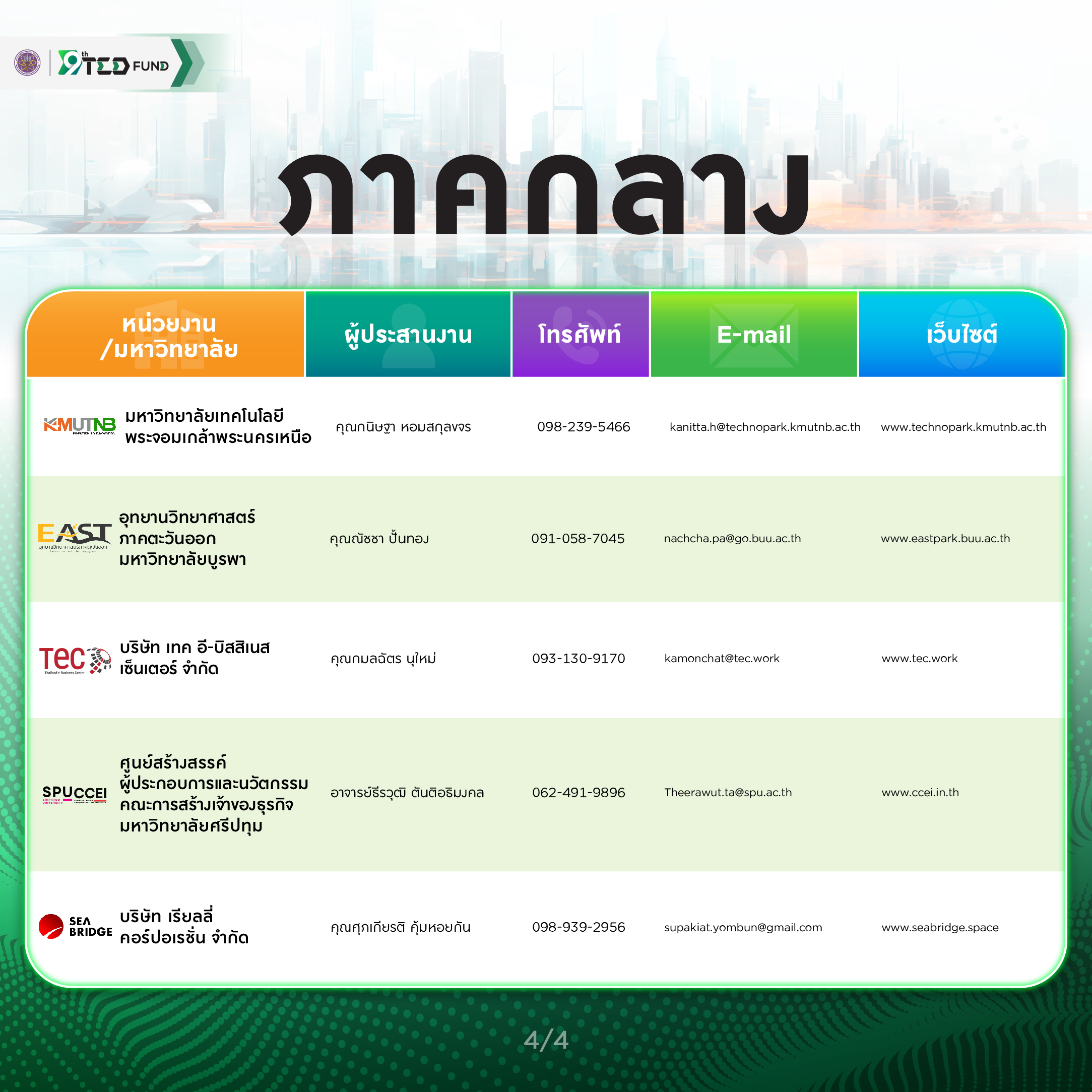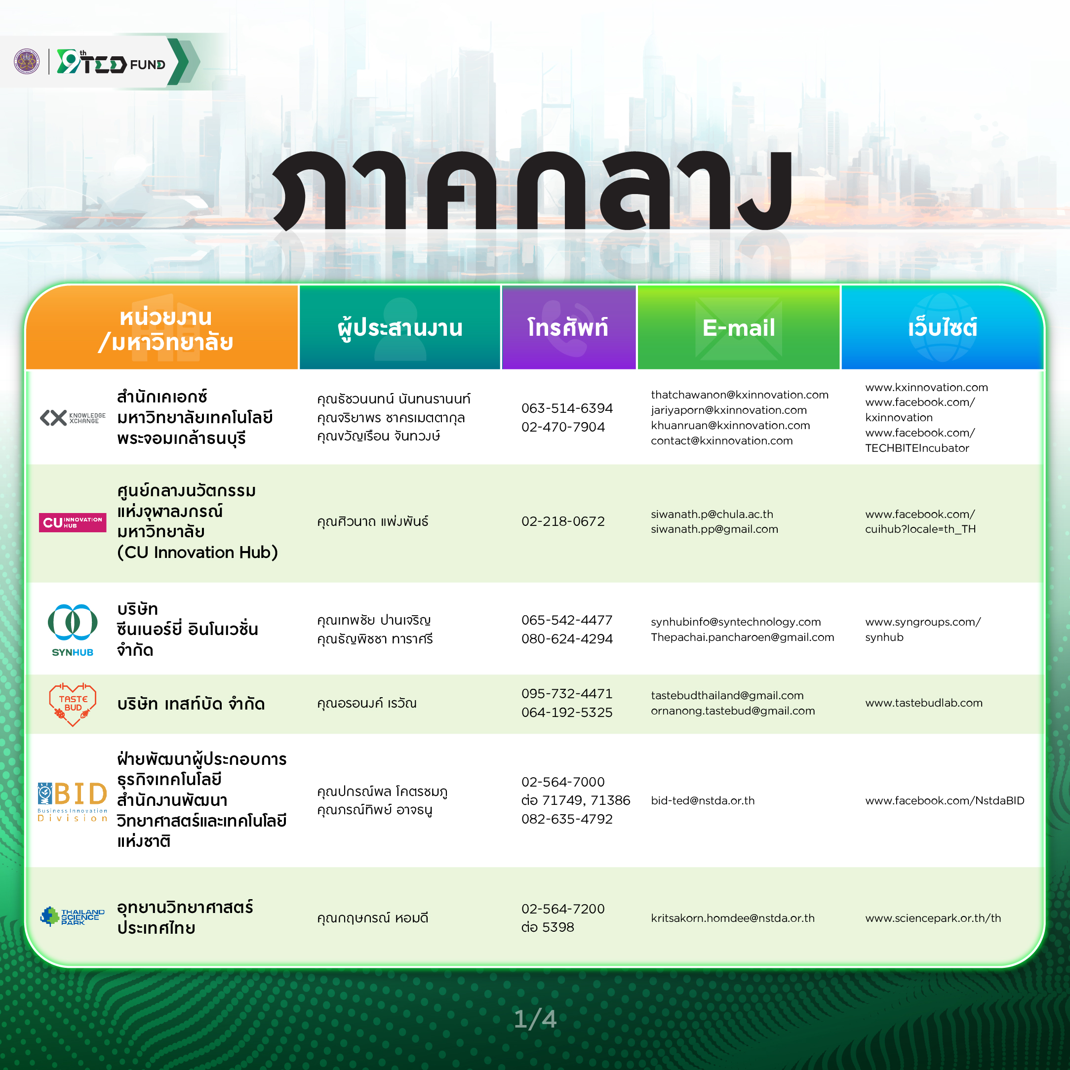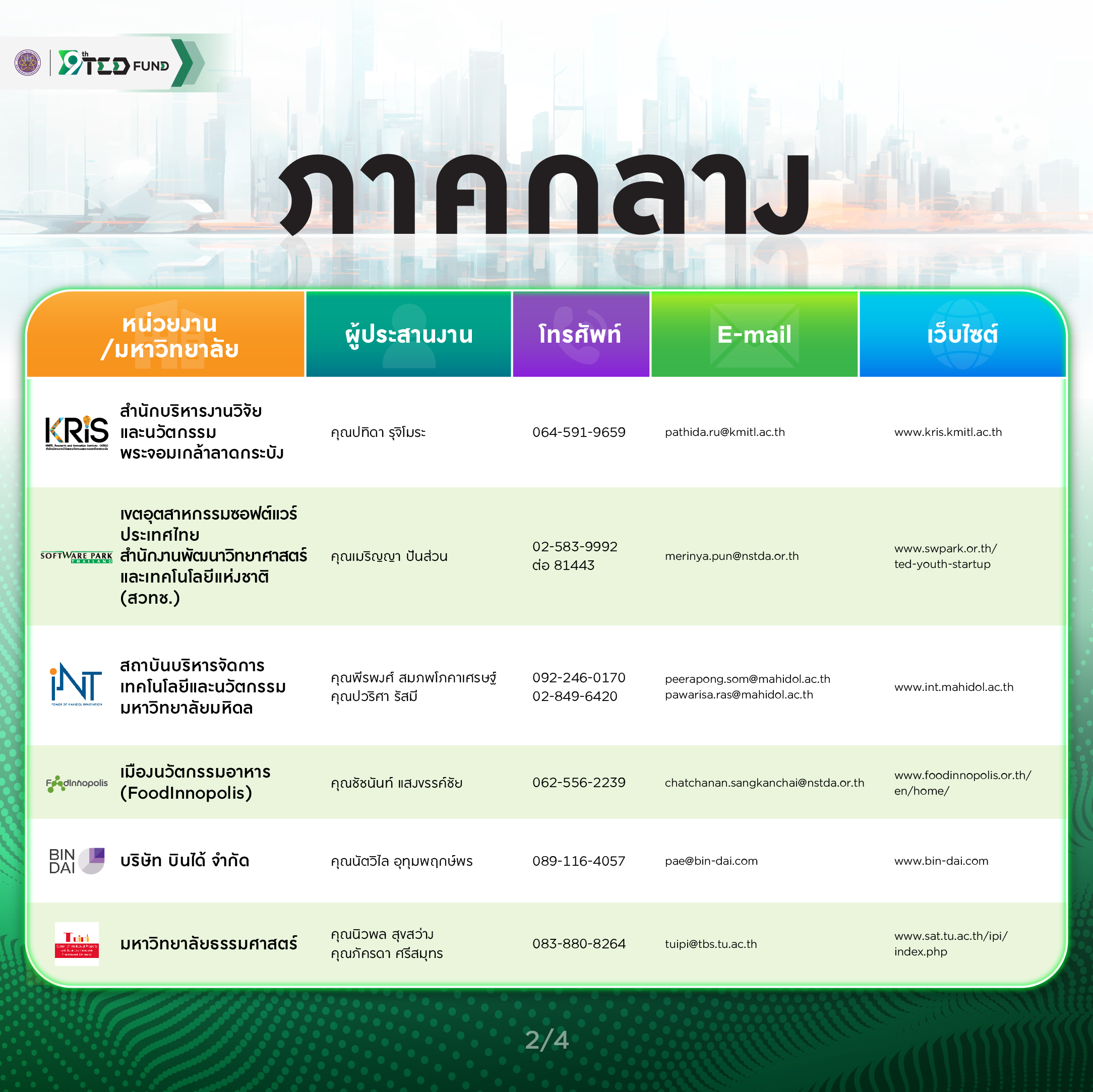 ผู้ที่สนใจขอทุนโครงการ TED Youth Startup ที่จะเปิดรับสมัครรอบที่ 1 / 2569 ในช่วงเดือนธันวาคมนี้ อย่าลืมเข้าไปติดต่อขอรับการสนับสนุนจากหน่วยงาน TED Fellow ทั่วทุกภาคของไทย