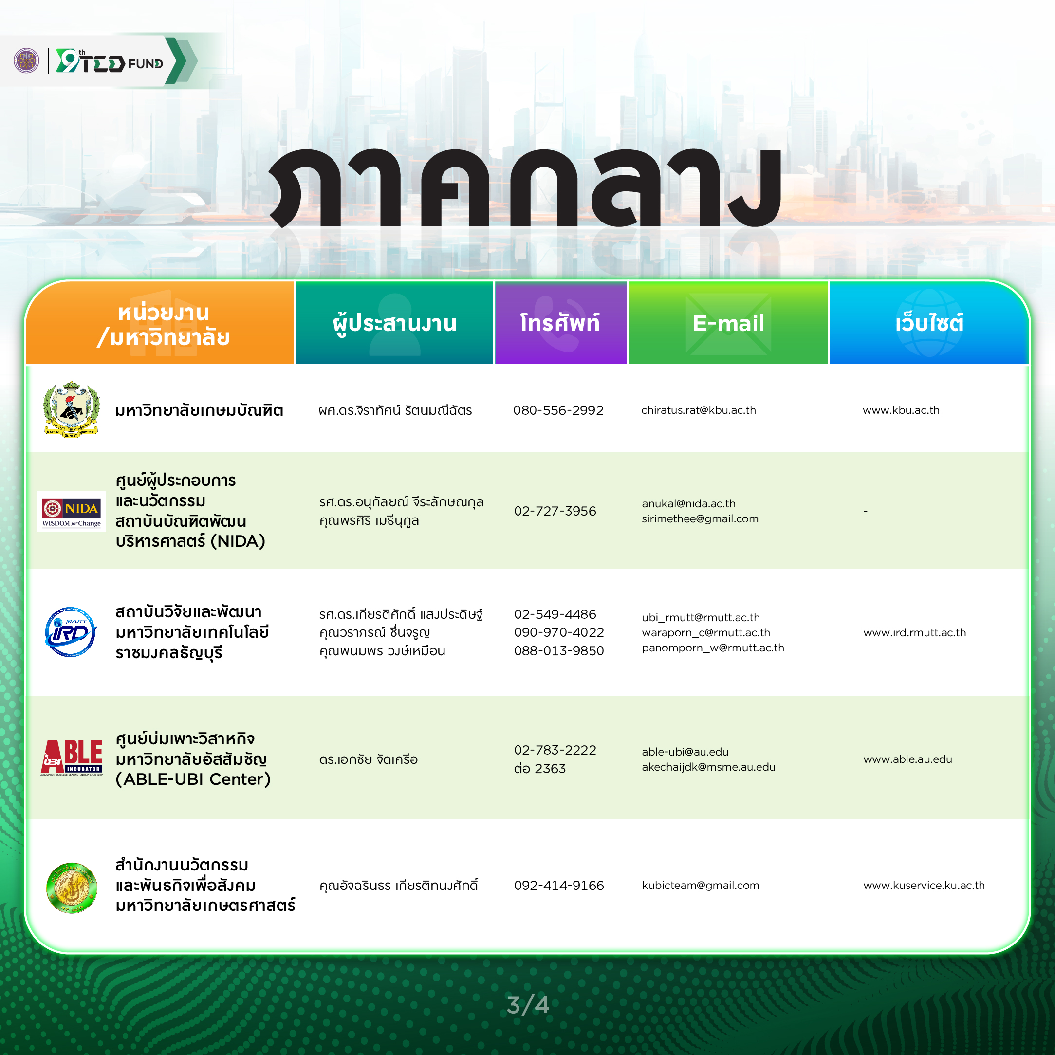 ประกาศรายชื่อเครือข่ายร่วมพัฒนาผู้ประกอบการ (TED Fellow) ที่พร้อมร่วมสนับสนุนผู้ประกอบการรุ่นใหม่เข้าร่วมโครงการ TED Youth Startup รอบที่ 1 / 2569 จำนวน 47 หน่วยงาน ได้แก่